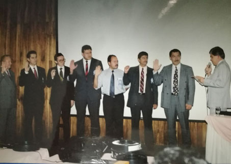 Fotografia de primera Junta directiva (1998-2000): de izquierda a derecha: Dr. Napoleón Cárdenas Aragón, Dr. Victor David Franco Escobar, Dr. Pedro Fuentes Bran, Dr. Marlon Iván Reyes González, Dr. Luis Mario Galán, Dr. Julio César Meléndez Argueta, Dr. Miguel Villalta Duke. Juramenta Dr. Carlos Ernesto Segura Maza